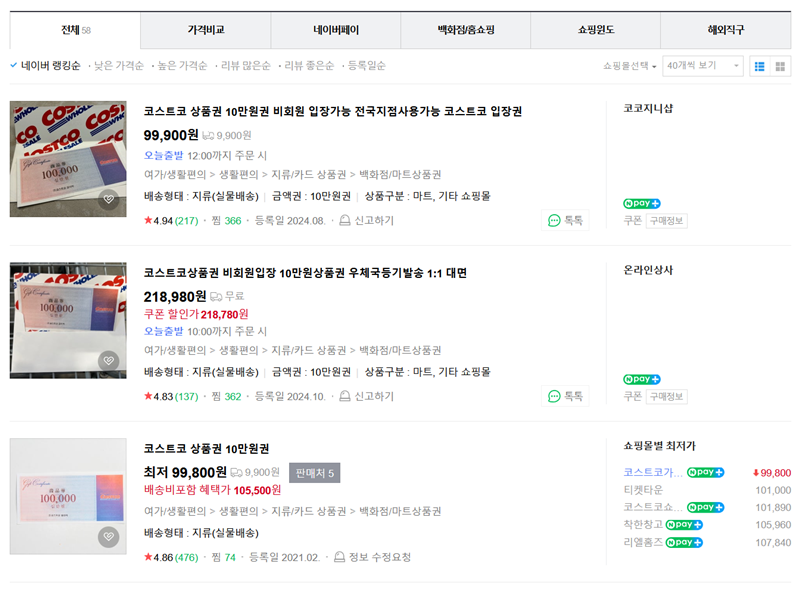 3. 직접 방문이 어렵다면 온라인 쇼핑몰을 이용하는 것도 좋은 방법입니다. 네이버 쇼핑과 같은 여러 온라인 플랫폼에서 다양한 판매자들이 코스트코 상품권을 판매하고 있어 편리하게 집에서 받아볼 수 있습니다.