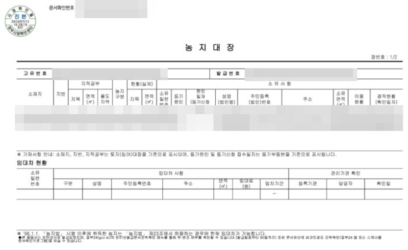 8. 모든 절차가 마무리되면 최종적으로 농지대장을 발급받을 수 있습니다. 이 서류에는 농지의 소재지, 면적, 소유 현황 등 상세한 정보가 기재되어 있습니다.