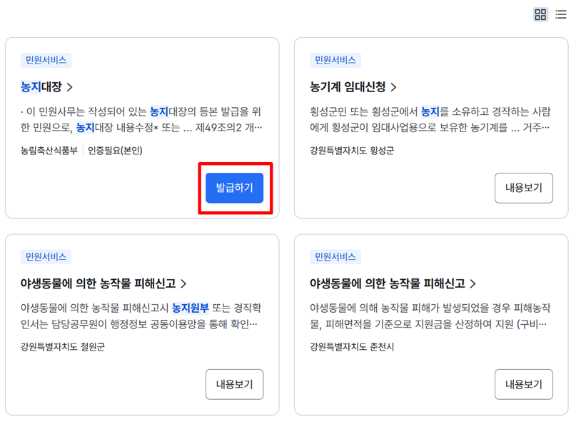3. 검색 결과에서 '농지대장' 민원 서비스를 찾을 수 있습니다. 여러 서비스 중에서 본인에게 해당하는 항목을 확인한 후 '발급하기'를 선택하여 신청 절차를 시작합니다.