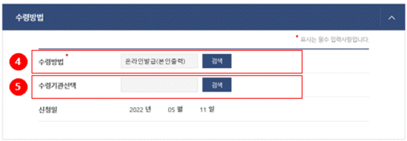 6. 신청서 하단에서는 발급받을 서류의 수령 방법을 선택해야 합니다. 온라인으로 직접 출력하거나, 원하는 기관을 지정하여 방문 수령하는 것 모두 가능하니 편한 방식을 고르면 됩니다.