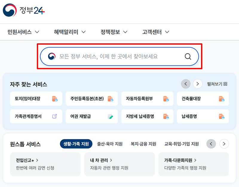 1. 정부24 홈페이지에 접속하면 중앙에 '모든 정부 서비스, 이제 한곳에서 찾아보세요'라고 적힌 검색창이 있습니다. 이곳을 통해 원하는 민원 서비스를 검색할 수 있습니다.