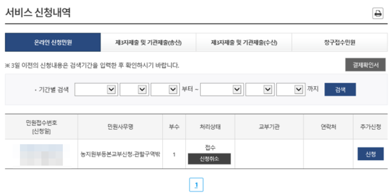 7. 신청을 완료하고 나면 서비스 신청내역 페이지에서 진행 상황을 확인할 수 있습니다. 민원 접수 번호와 함께 처리 상태가 '접수'로 표시된 것을 통해 정상적으로 신청이 완료되었음을 알 수 있습니다.
