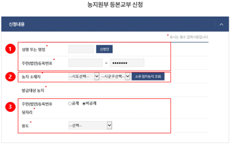 5. 신청서 작성 화면으로 넘어가면 신청인 정보, 농지 소재지, 그리고 발급 대상 농지에 대한 세부 정보를 차례대로 입력합니다. 각 항목을 꼼꼼히 확인하며 작성해야 합니다.