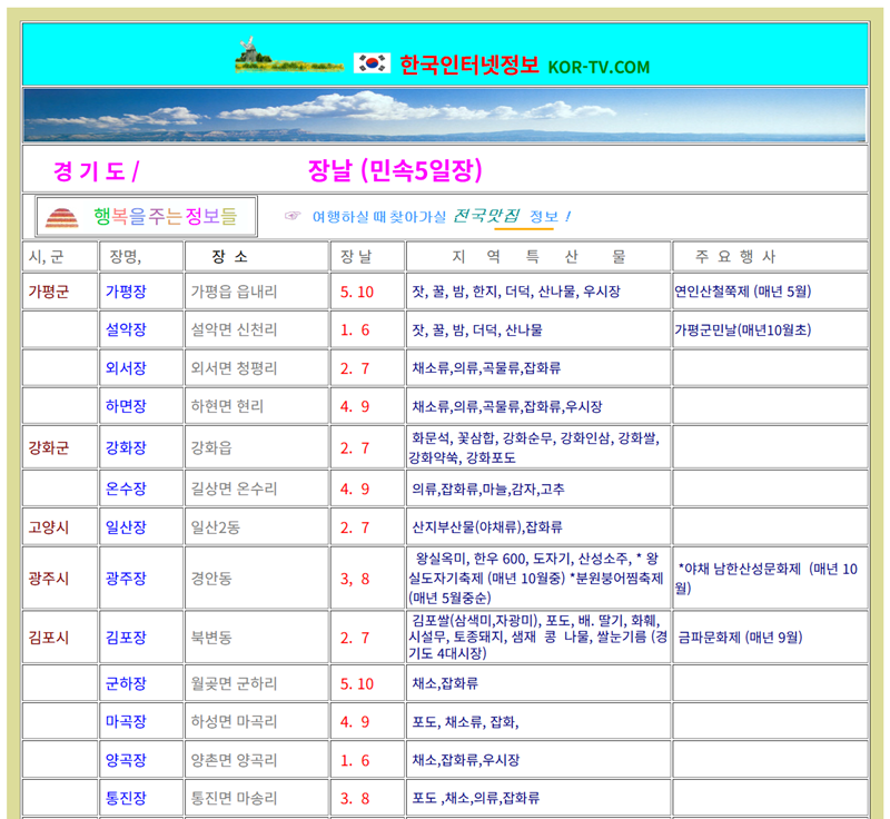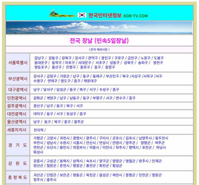 지역마다 열리는 5일장의 날짜는 제각각이라 일일이 찾아보기 번거로울 수 있습니다. 이럴 때 전국의 장날 정보를 한곳에 모아둔 곳이 있다면 무척 편리하겠죠. 각 지역별 시장의 이름과 열리는 날짜는 물론, 어떤 특산물이 유명한지까지 정리된 정보를 활용하면 더욱 알찬 나들이를 계획할 수 있습니다. 한국인터넷정보 KOR-TV 홈페이지에서 전국의 5일장 정보를 조회할 수 있습니다.