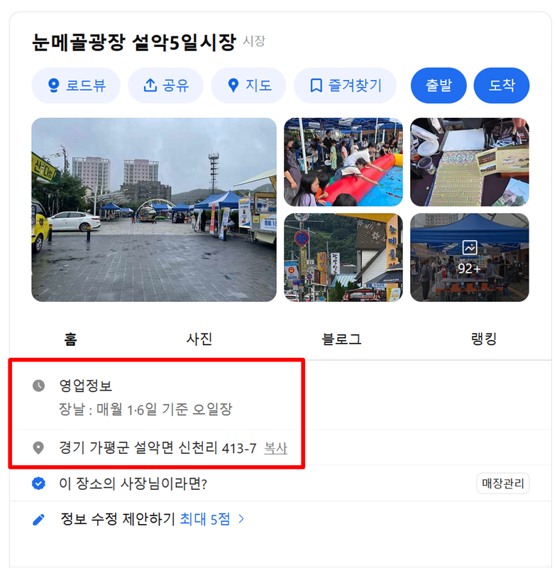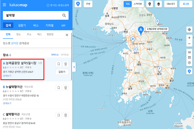6. 가고 싶은 시장의 이름과 대략적인 위치를 알았다면, 지도 앱에서 '설악장'과 같이 검색하여 정확한 위치를 파악할 수 있습니다. 검색 결과를 통해 '눈메골광장 설악5일시장'이라는 공식 명칭과 주소를 확인할 수 있습니다.