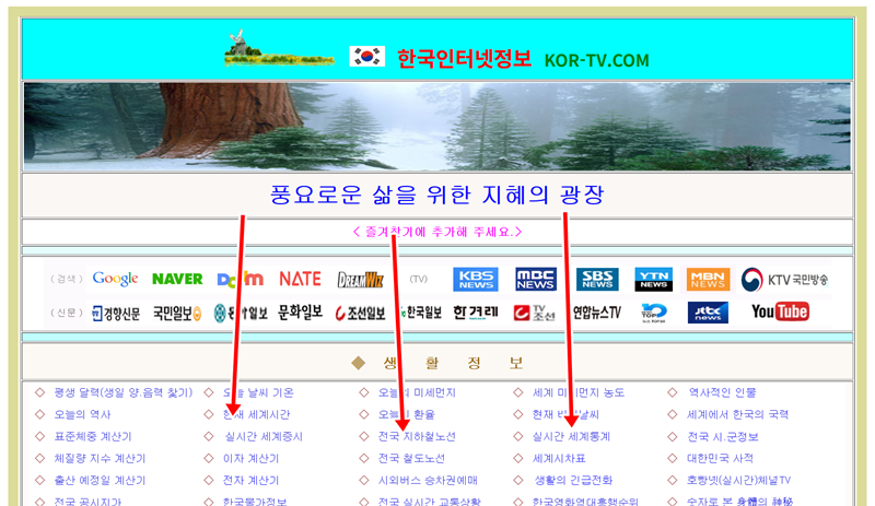 1. 우선 포털 검색창을 통해 '한국인터넷정보 KOR-TV'를 찾아보세요. 검색 결과 상단에 나타나는 사이트로 접속하면 다양한 생활 정보를 확인할 수 있는 메인 화면으로 이동하게 됩니다.