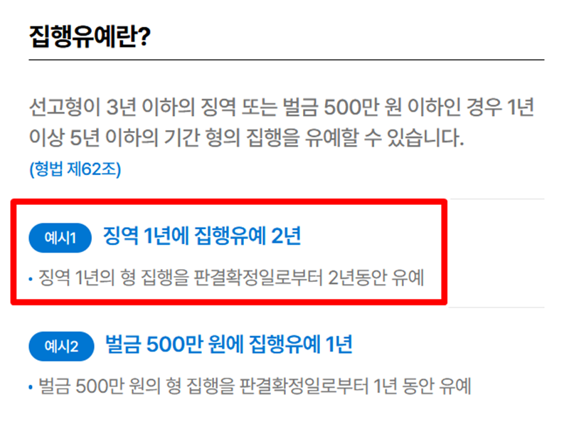1. '징역 1년에 집행유예 2년'이란, 1년의 징역형 집행을 판결이 확정된 날로부터 2년 동안 미루어준다는 의미입니다. 집행유예는 선고되는 형이 3년 이하의 징역이거나 500만 원 이하의 벌금일 경우, 1년에서 5년 사이의 기간 동안 그 집행을 미뤄주는 제도라고 할 수 있습니다.