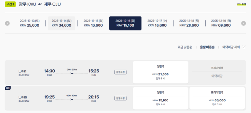 2. 광주에서 제주로 가는 항공편을 조회하면, 선택한 날짜 주변의 항공권 가격을 한눈에 비교할 수 있습니다. 가장 저렴한 날짜를 쉽게 찾을 수 있으며, 원하는 날짜를 선택하면 해당일의 운항 스케줄과 시간대별 가격이 자세히 안내됩니다.