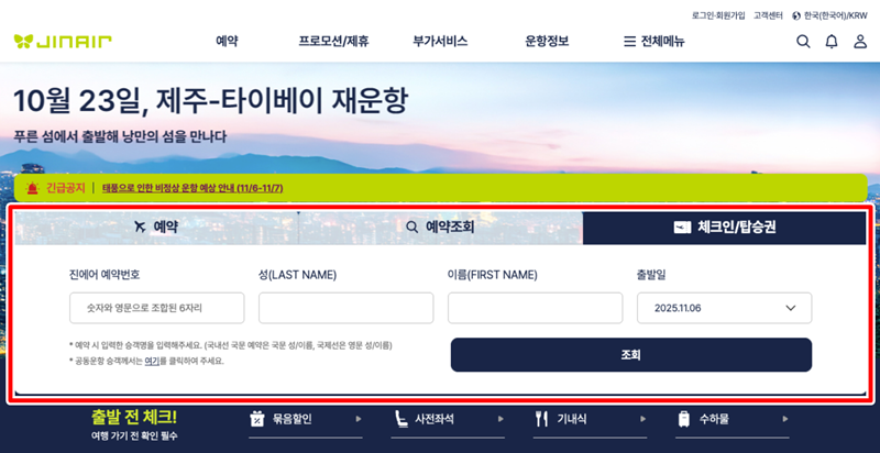 1. 항공권 예매를 위해 홈페이지에 접속하면 가장 먼저 예약 정보를 입력하는 화면이 나타납니다. '체크인/탑승권' 메뉴에서 예약번호, 이름, 출발일 등 개인 정보를 입력하여 예매 내역을 조회하거나 새로운 항공편 예약을 시작할 수 있습니다.