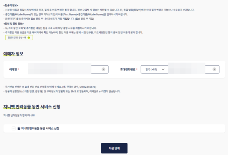 5. 탑승객 정보 입력 화면 하단에서는 이메일 주소와 휴대폰 번호 등 연락처를 기입하게 됩니다. 이 정보를 통해 예약 관련 안내나 변경 사항을 전달받을 수 있으므로, 정확하게 입력한 후 다음 단계로 이동합니다.