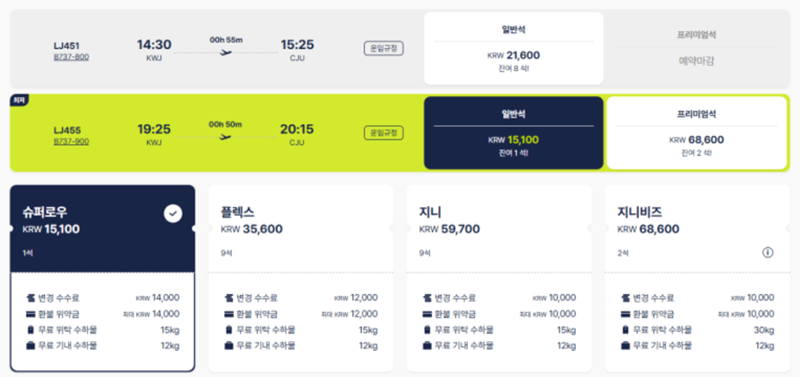3. 원하는 항공편을 선택하면 슈퍼로우, 플렉스, 지니, 지니비즈 등 다양한 운임 종류가 나타납니다. 각 운임은 변경 수수료나 환불 위약금, 무료 수하물 규정이 다르므로 본인의 여행 계획에 맞는 조건을 꼼꼼히 비교하여 선택해야 합니다.