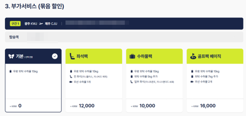 6. 부가 서비스 단계에서는 기본 운임 외에 좌석팩, 수하물팩, 골프팩 등 여러 묶음 할인을 선택할 수 있습니다. 무료 위탁 수하물이 15킬로그램 제공되는 기본 항목을 그대로 유지하거나, 필요에 따라 추가 비용을 내고 다른 항목을 고를 수 있습니다.
