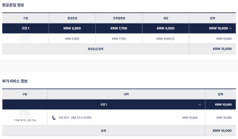 9. 마지막 결제 단계에서는 최종 운임 정보를 상세히 확인할 수 있습니다. 기본 항공운임과 유류할증료, 세금이 포함된 총 항공권 가격과 함께, 사전 좌석 지정 등 부가 서비스로 인해 추가된 비용이 별도로 표시되어 총 결제 금액을 명확하게 안내합니다.