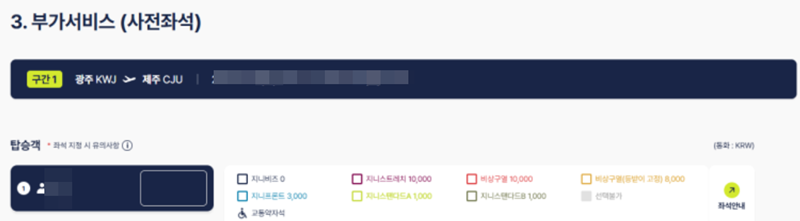 7. 사전 좌석 지정 단계에서는 좌석 종류에 따라 추가 요금이 발생하는 것을 확인할 수 있습니다. 가장 편안한 지니비즈 좌석부터 넓은 공간의 지니스트레치, 비상구 좌석, 그리고 일반 좌석까지 종류별로 가격이 다르게 책정되어 있습니다.