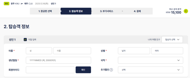 4. 항공권 선택을 마친 후에는 탑승객의 정보를 정확하게 입력해야 합니다. 이름, 성별, 생년월일, 국적 등 개인 정보를 오타 없이 기입하고, 필요한 경우 추가 할인 항목을 선택하여 적용할 수 있습니다.