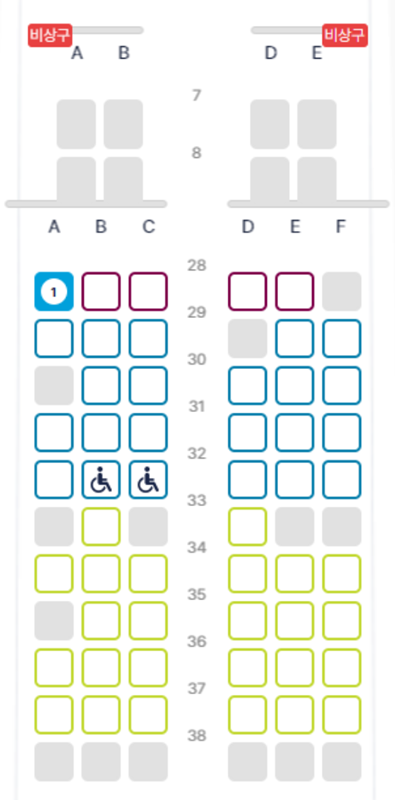 8. 실제 비행기 좌석 배치도를 보면서 원하는 자리를 직접 고를 수 있습니다. 이미 선택된 좌석은 회색으로 표시되며, 비어 있는 좌석 중에서 원하는 위치를 선택하면 해당 좌석이 파란색으로 표시되며 예약이 진행됩니다.