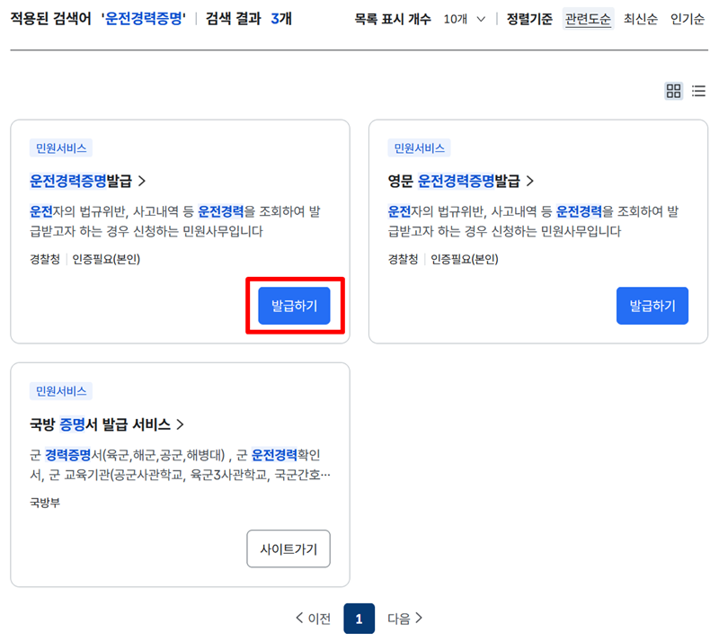3. 검색 결과 화면에서는 운전경력증명 발급을 포함한 여러 관련 민원 서비스를가 나타납니다. 이 중에서 국문으로 된 '운전경력증명발급'의 '발급하기'를 선택합니다.