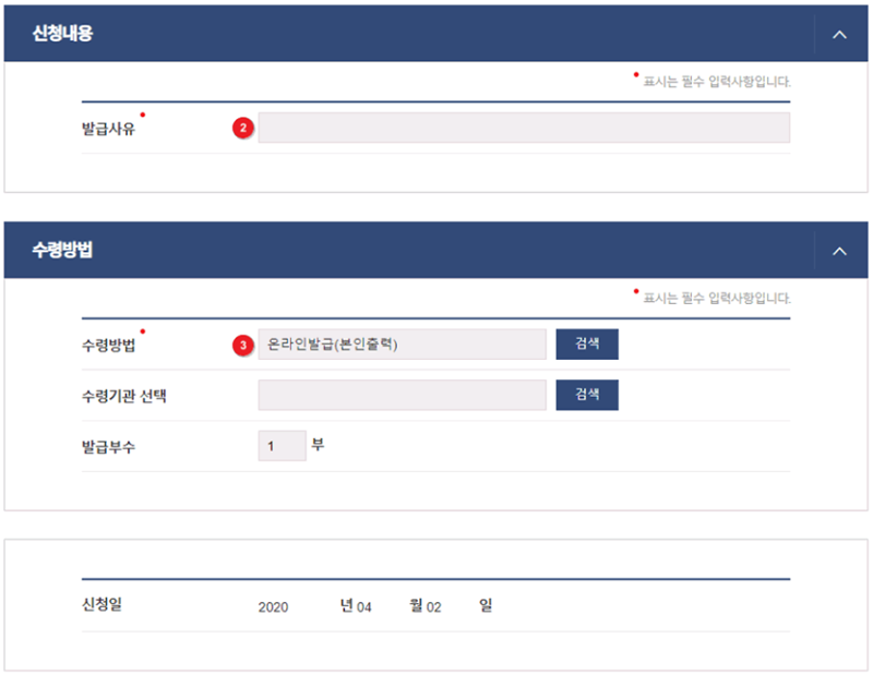 6. 신청 내용 항목에서는 발급 사유를 간단히 기재하고, 수령 방법을 '온라인발급(본인출력)'으로 선택합니다. 발급 부수 또한 필요에 맞게 지정할 수 있습니다.