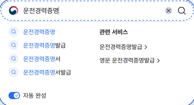 2. 검색창에 '운전경력증명'이라고 입력하면, 자동으로 관련된 여러 서비스 목록이 나타납니다. 여기서 가장 기본적인 '운전경력증명'을 선택하여 다음 단계로 넘어갑니다.