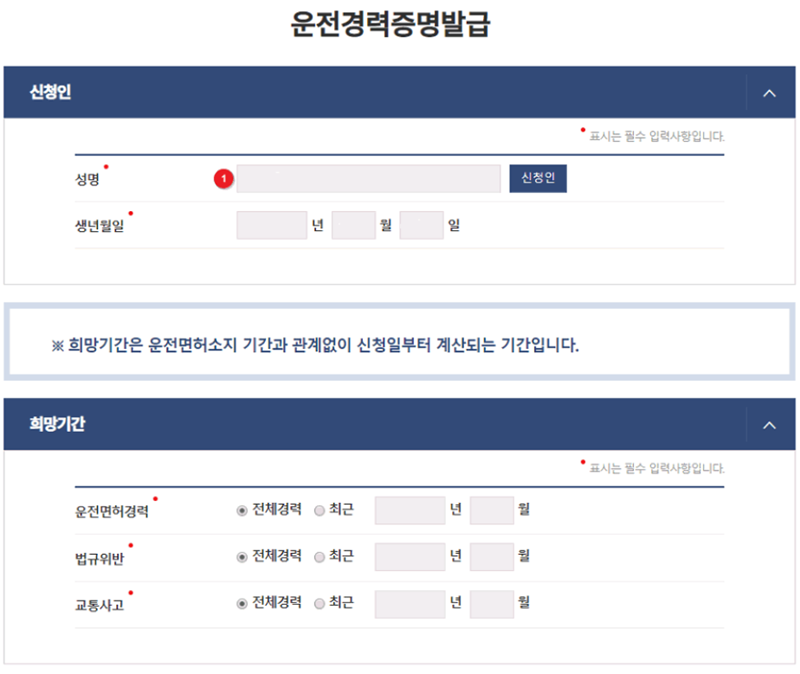 5. 로그인이 완료되면 신청서 작성 화면이 나타납니다. 신청인 정보는 자동으로 입력되며, 운전면허경력, 법규위반, 교통사고 등 필요한 경력의 조회 기간을 전체 또는 최근으로 설정할 수 있습니다.