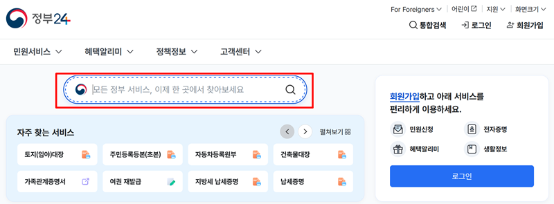 1. 정부24 홈페이지에 접속하면 중앙에 있는 검색창을 통해 원하는 민원 서비스를 바로 찾아볼 수 있습니다. 이곳에 필요한 서류의 이름을 입력하면 됩니다.