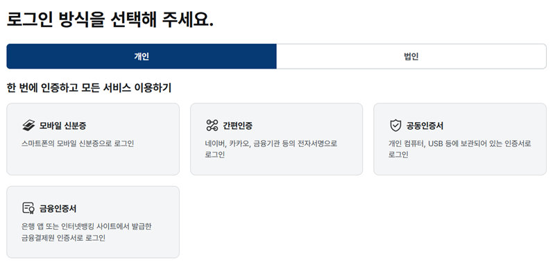 4. 증명서 발급을 위해서는 본인 인증이 필요합니다. 모바일 신분증, 간편인증, 공동인증서 등 여러 가지 방식 중 자신에게 가장 편한 방법을 선택하여 로그인을 진행합니다.