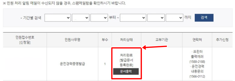 7. 신청이 완료된 후 처리 상태를 확인하는 화면으로 이동합니다. 처리 상태가 '처리완료'로 바뀌면, '문서출력'을 통해 증명서를 인쇄하거나 전자문서로 저장할 수 있습니다.