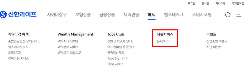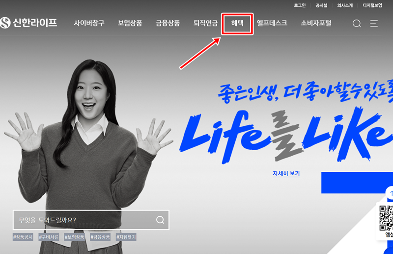 1. 신한라이프 홈페이지에 접속하여 상단 메뉴 중 '혜택' 항목을 선택합니다. 이곳에서는 생활에 유용한 다채로운 정보와 서비스들을 만나볼 수 있습니다.