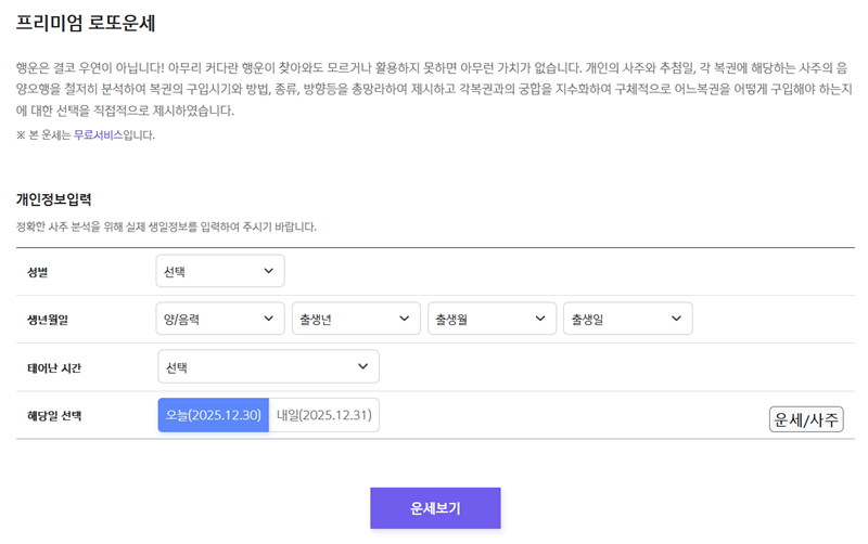 4. 개인정보 입력 화면이 나타나면 성별, 생년월일, 태어난 시간 등을 정확하게 입력해 주세요. 모든 정보는 운세 분석에만 활용되며, 서비스는 무료로 이용할 수 있습니다.