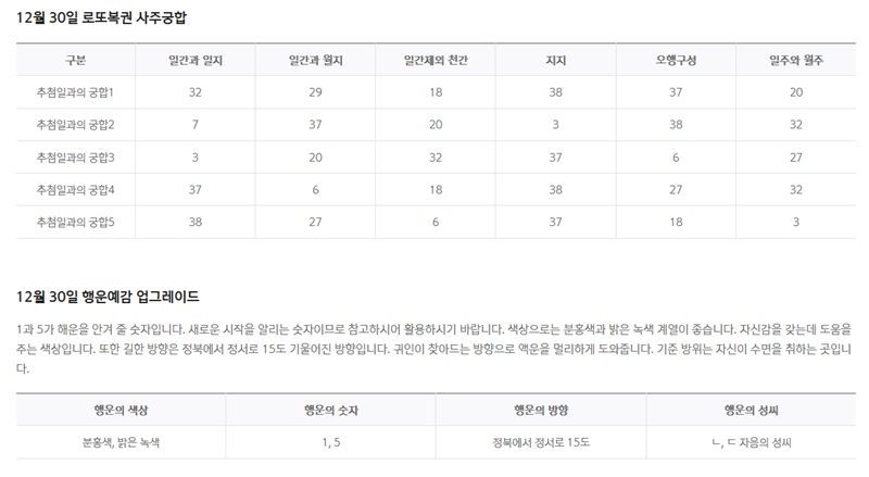 7. 더 아래로 내려가면 추천 조합뿐만 아니라, 행운의 색상, 숫자, 방향 등 사주에 맞는 다양한 행운 정보까지 상세하게 안내해주어 복권을 구매할 때 참고하기 좋습니다.
