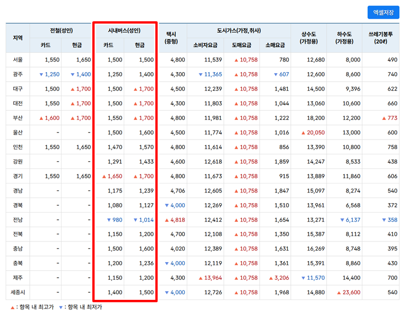 4. 조회가 완료되면 화면에 지역별 공공요금 표가 나타납니다. 이 표에서 '시내버스(성인)' 항목을 보면 각 지역의 카드 요금과 현금 요금을 상세하게 확인할 수 있습니다. 오르거나 내린 요금 정보도 화살표로 표시되어 변동 사항을 쉽게 알 수 있어요.