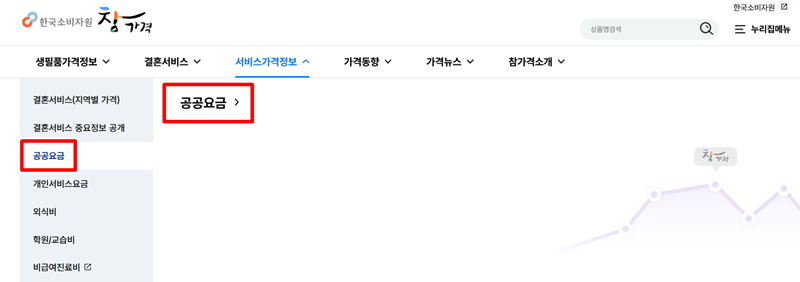 2. '서비스가격정보'를 누르면 아래로 세부 목록이 나타납니다. 여기서 '공공요금'을 선택해 주세요. 버스 요금을 포함한 여러 공공 분야의 요금을 조회하는 화면으로 이동하게 됩니다.