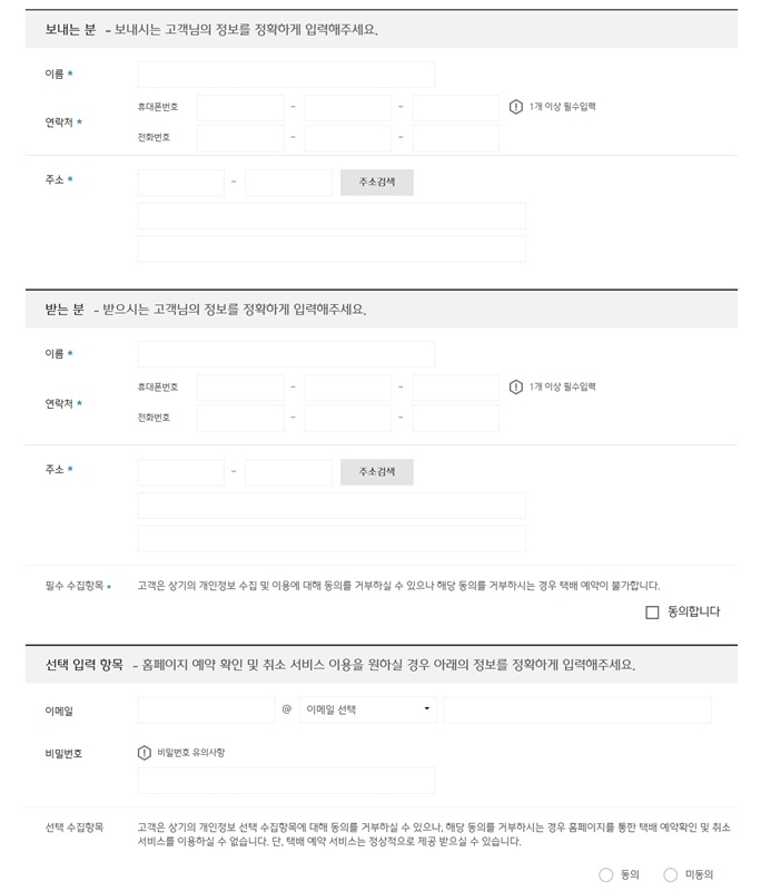 모바일에서도 마찬가지로 보내는 사람과 받는 사람의 정보를 차근차근 입력합니다. 이름, 연락처, 주소 같은 필수 정보를 다 적고, 방문 희망 날짜를 선택하면 다음으로 넘어갈 수 있습니다. 마지막으로 보낼 물건의 종류와 가격 같은 상세 정보를 입력하고, 유의사항을 확인한 뒤 동의하면 끝. 모든 정보를 다시 한번 꼼꼼히 확인하고 예약 신청을 누르면 정말 간단하게 접수가 완료됩니다.