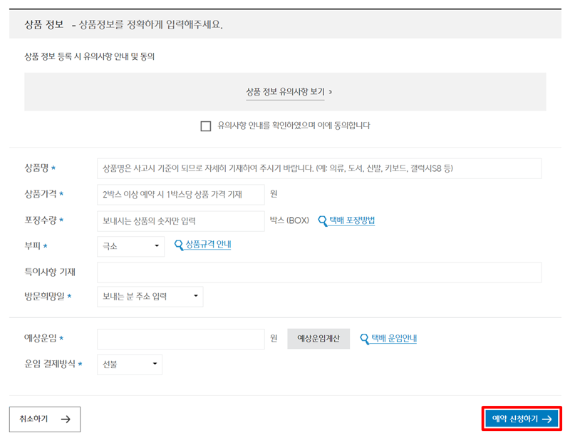 그다음은 보낼 물건의 정보를 입력하는 단계예요. 어떤 물건인지, 가격은 얼마인지, 박스 크기는 어느 정도인지 선택하고 기사님이 방문했으면 하는 날짜를 정합니다. 여기서 예상 운임도 바로 확인할 수 있어서 좋더라고요. 마지막으로 운임 결제 방법을 선택하고 '예약 신청하기' 버튼을 누르면 모든 과정이 끝납니다.