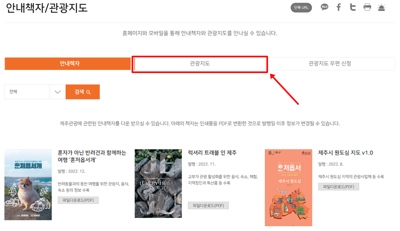 2. 안내책자와 관광지도 두 가지 항목 중에서 '관광지도'를 선택하면 지도를 내려받을 수 있는 화면으로 이동합니다. 이곳에서는 온라인으로 지도를 확인하거나 우편으로 실제 지도를 신청하는 것도 가능합니다.