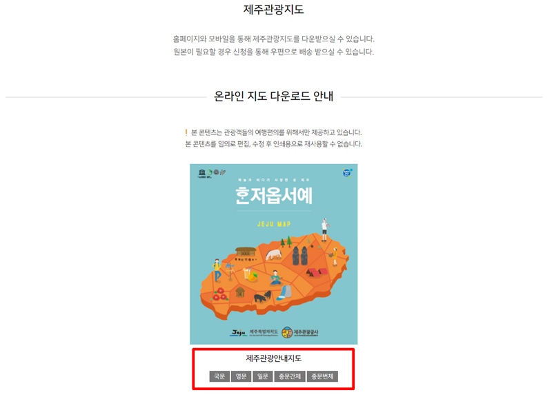 3. 온라인 지도 내려받기 안내 아래를 보면, 제주관광안내지도를 국문, 영문, 일문, 중문 간체, 중문 번체 등 여러 언어로 받을 수 있도록 준비되어 있습니다. 원하는 언어를 골라 지도를 확인할 수 있습니다.