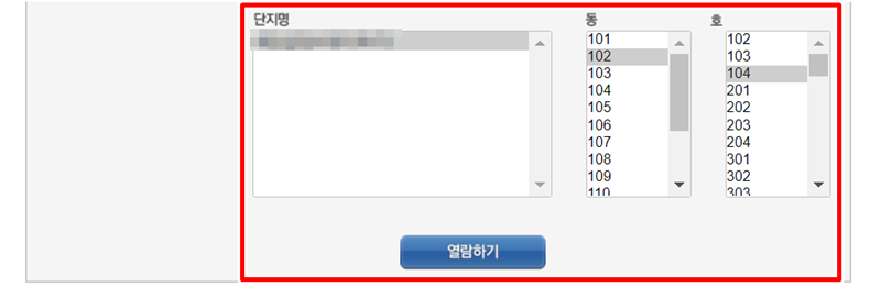주소 검색을 마치면, 해당 주소에 위치한 아파트 단지명과 동, 호수를 선택하는 단계가 나타납니다. 드롭다운 목록에서 조회하려는 아파트의 단지명을 정확하게 찾아서 선택하고, 바로 옆에서 동과 호수까지 골라주세요. 모든 정보를 정확하게 입력했다면, 아래쪽에 보이는 '열람하기' 부분을 눌러 다음 단계로 넘어가면 거의 모든 과정이 끝납니다.