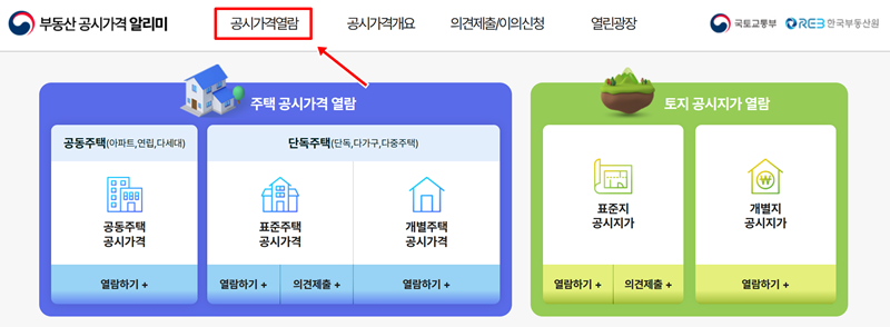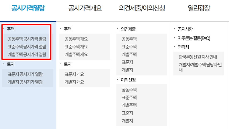 '공시가격열람'으로 들어오면 주택과 토지로 나뉜 세부 메뉴들이 나타납니다. 우리는 아파트 기준시가를 조회하려는 것이므로, '주택' 항목 아래에 있는 '공동주택 공시가격 열람'을 선택해주시면 됩니다. 만약 단독주택이나 토지의 가격이 궁금하다면, 같은 화면에서 해당하는 다른 메뉴를 고르면 되니 참고하시면 좋겠습니다.