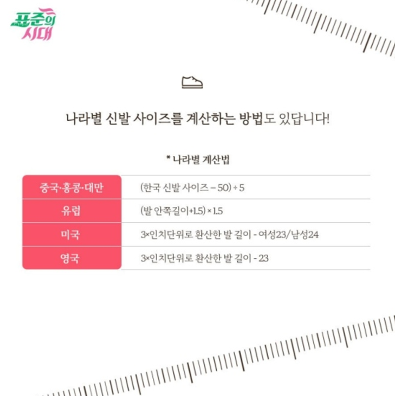 나라별 신발 사이즈를 직접 계산하는 방법도 있긴 해요. 우리나라 사이즈를 기준으로 복잡한 수식을 더하고 곱해서 다른 나라 사이즈로 변환하는 것인데요. 예를 들어 유럽 사이즈는 발 안쪽 길이에 1.5를 더한 후 다시 1.5를 곱하는 식이에요. 하지만 솔직히 쇼핑할 때마다 이렇게 계산하는 건 너무 번거롭고 헷갈리기 쉬워요. 그래서 이런 계산법이 있다는 것 정도만 알아두고, 우리는 간편하게 정리된 사이즈표를 활용하는 것이 훨씬 효율적이랍니다.
