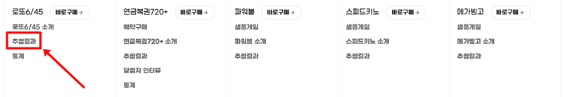 '추첨식 복권' 위로 마우스를 올리면 아래로 세부 메뉴가 나타납니다. 로또6/45, 연금복권720+ 등 여러 복권 종류가 보이는데요. 우리는 로또 번호를 확인할 것이므로 가장 왼쪽에 있는 '로또6/45' 항목 아래를 살펴봐 주세요. 여러 소메뉴 중에서 '추첨결과'라는 부분을 찾아서 눌러주시면 됩니다.