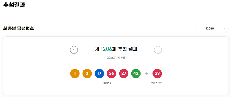 '추첨결과' 페이지로 들어오면 가장 최근에 추첨한 회차의 당첨 번호가 제일 먼저 보입니다. 오늘 날짜를 기준으로 가장 마지막에 발표된 1206회차의 당첨 번호와 보너스 번호가 화면 중앙에 표시되어 있네요. 여기서는 특정 회차의 번호를 개별적으로 확인할 수 있습니다.