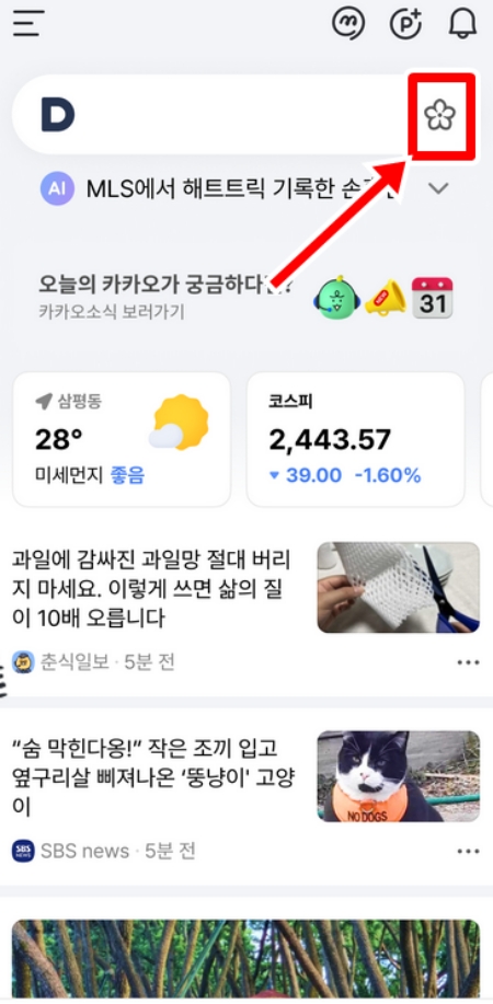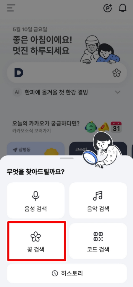 길가에 핀 예쁜 꽃의 이름이 궁금할 때, 스마트폰에서 '다음' 어플을 실행해 주세요. 첫 화면을 보시면 상단 검색창 바로 오른쪽에 하얀색 꽃 모양 아이콘이 보일 거예요. 이 아이콘을 누르면 사진이나 소리로 검색할 수 있는 여러 기능이 나타납니다.