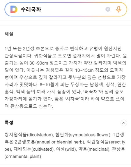 검색 결과 화면을 아래로 조금 더 내려보면 '해설'과 '특성' 항목에서 더 자세한 내용을 확인할 수 있어요. 수레국화가 어떤 환경에서 자라는지, 줄기나 잎의 모양은 어떤지 등 식물도감처럼 전문적인 설명이 담겨 있어서 아이들 교육용으로 활용하기에도 정말 좋겠다는 생각이 들었어요.