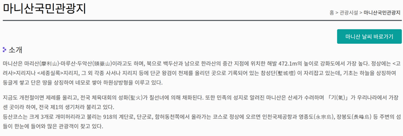 1. 먼저 마니산에 대한 소개부터 나와있습니다. 마니산은 강화도에서 가장 높은 산으로 마리산, 마루산, 두악산 등 다양한 이름으로 불려왔습니다. 이곳 정상에는 단군이 하늘에 제사를 올렸다는 참성단이 자리하고 있어 역사적인 의미도 깊습니다. 특히 산세가 아름답고 기운이 맑기로 유명해 예부터 많은 이들이 찾는 민족의 성지로 알려져 있습니다.
