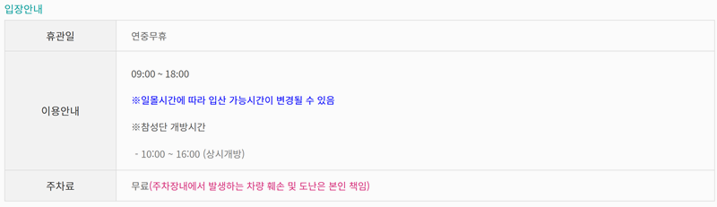 3. 입장료는 어린이, 청소년, 어른으로 나뉘며 개인과 단체에 따라 요금이 달라집니다. 또한 6세 이하 어린이나 65세 이상 어르신, 국가유공자 등은 무료로 입장할 수 있어 가족 단위 방문객에게도 부담이 적은 편입니다. 군민과 군장병 역시 혜택이 따로 마련돼 있습니다.