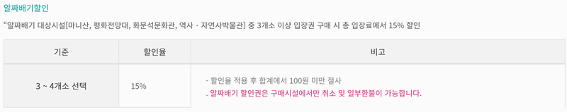 4. 마니산, 평화전망대, 화문석문화관, 역사자연사박물관 중 3곳 이상을 함께 관람하면 입장료의 15%를 할인받을 수 있는 제도가 있습니다. 할인권은 구매한 곳에서만 취소나 일부 환불이 가능해 이용 시 이 점 참고하시는 게 좋습니다.