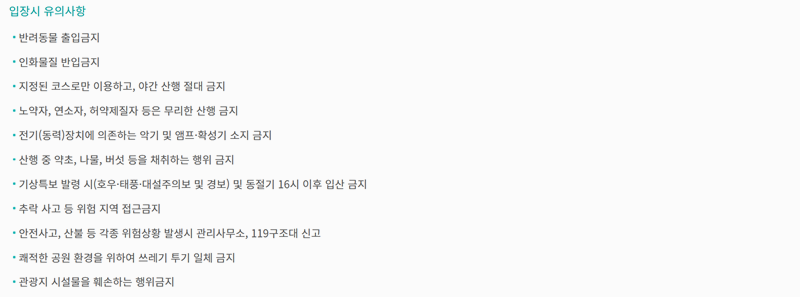 8. 마니산 입장 시에는 반려동물 출입과 인화물질 반입이 금지되며 지정된 코스 외 산행이나 야간 산행도 제한됩니다. 특히 무리한 산행은 삼가야 하고 쓰레기 투기나 약초 채취 같은 행위도 금지되어 있어 쾌적한 환경을 지키며 이용하는 것이 원칙입니다.