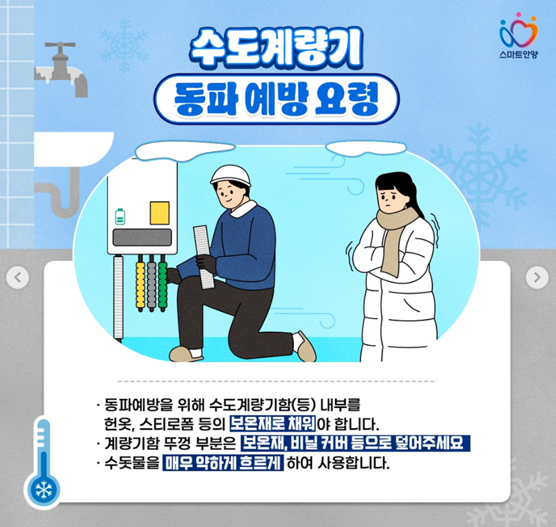 우리 집 상수도 시설의 보온 상태를 미리 점검하는 것만으로도 겨울철 큰 불편을 막을 수 있어요. 특히 수도계량기 동파는 비용 발생은 물론이고 생활에 큰 불편을 초래하므로 각별한 주의가 필요해요. 계량기 보호통 안에는 헌 옷이나 스티로폼, 보온 덮개 등을 채워 넣어 찬 공기가 들어가지 않도록 막아주세요. 또한 외부에 노출된 수도관 역시 보온재로 단단히 감싸주는 것이 좋아요. 마당에 설치된 수도는 밸브를 잠그는 것만으로는 부족할 수 있으니, 잊지 말고 신경 써주세요.