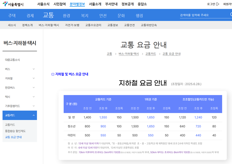 지역별 차이 외에 연령에 따른 세부적인 금액도 궁금해져서 서울특별시에서 운영하는 안내 페이지도 함께 찾아보았는데요. 여기서는 일반, 청소년, 어린이로 구분된 상세한 표를 볼 수 있었고, 조조할인처럼 특정 시간에 적용되는 혜택까지 아주 자세하게 안내되어 있어서 상황별로 얼마를 내야 하는지 정확히 알 수 있었어요.