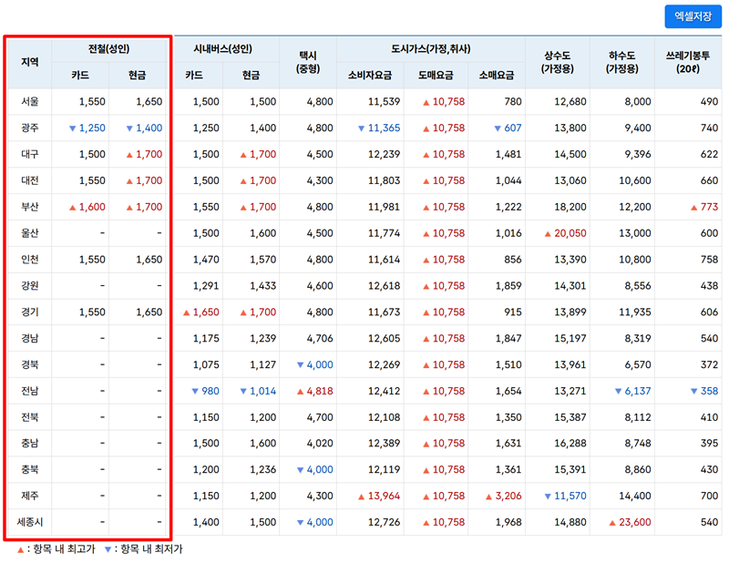 조회를 마치면 하단에 상세한 표가 나타나는데 여기서 가장 첫 번째 줄에 있는 전철 성인 항목을 유심히 살펴보았어요. 서울부터 부산까지 각 지역별로 교통카드를 썼을 때와 현금을 냈을 때의 금액 차이가 명확하게 나와 있어서 제가 사는 지역의 비용이 얼마인지 단번에 파악할 수 있었답니다.